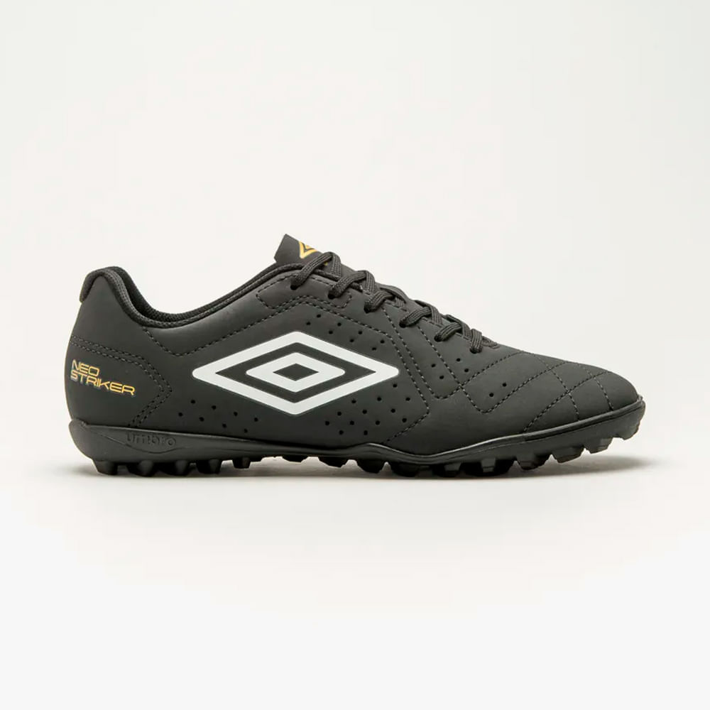 Produzida com material resistente e de alta durabilidade, a Umbro Neo Striker possui cabedal sintético texturizado que melhora o toque e o domínio da bola, além de recortes estratégicos que se adaptam ao formato do pé. Seu fechamento em cadarço oferece ajuste firme e personalizado, enquanto o solado emborrachado com travas fixas garante excelente tração e equilíbrio nas partidas. A estampa esportiva com o logo Umbro traz identidade marcante e visual arrojado para quem gosta de unir desempenho e estilo.